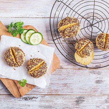 Den Teig mit bemehlten Händen zu runden Brötchen formen und auf ein Backblech legen. Brötchen einmal oder kreuzweise leicht einschneiden und - wenn du möchtest - etwas mit Leinsamen Toppen.