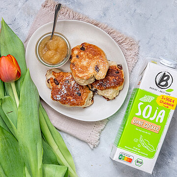 Mehl, Sprudelwasser, restlicher Hafer Natur oder Soja ohne Zucker, Zucker, Stärke, 1 Prise Salz, Rosinen nach Belieben