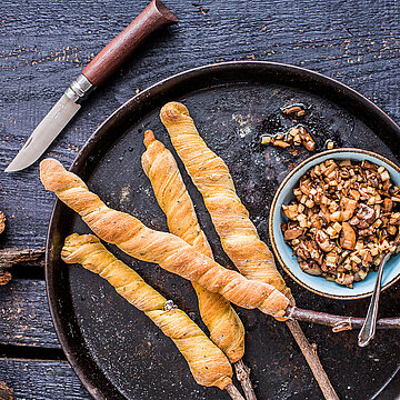 Teig auf einer leicht bemehlten Fläche erneut kurz durchkneten, zu einer Rolle formen und in kleinere 50-60 Gramm schwere Kugeln unterteilen. Die Kugeln zu einer dünnen Rolle formen und eng um einen sauberen, glatten Stock wickeln. Den Teig gut festdrücken.