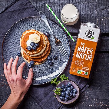 Für den Pancake-Teig den Bio Hafer Drink und alle restlichen Zutaten, bis auf die Blaubeeren, in einer Schüssel mit einem Schneebesen gut vermengen bis ein glatter, dicker Teig entstanden ist.