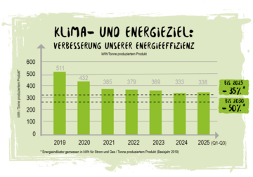 Berief hat sich als Ziel gesetzt, die Emissionen im Verhältnis zum Produkt zu senken. Konkret heißt das: Den Energieverbrauch in kWh pro Tonne produziertem Produkt bis 2030 um 50 Prozent zu reduzieren (Basisjahr 2019).