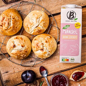 Die Brioches mit etwas Bio Mandeldrink bestreichen, mit Mandelblättchen dekorieren, direkt in den heißen Ofen geben und für 15-20 Minuten backen. Dann sollten sie schön goldbrauch sein.