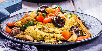 Vor dem Servieren das Gemüse mit der Petersilie würzen und gemeinsam mit den Couscous auf einem Teller anrichten. Nach Belieben mit grob gehackten Pistazien toppen. Wir wünschen guten Appetit!