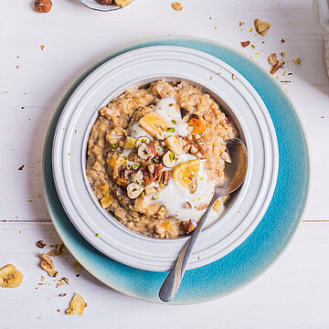 Das Porridge in Schüsseln verteilen und mit den Zutaten für das Topping garnieren.