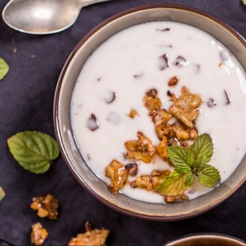 Die Creme auf Schalen oder Gläser verteilen und mit den karamellisierten Walnüssen garnieren.