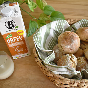 Zu den trockenen Zutaten den Bio Hafer ohne Zucker Drink, weiche Margarine und die restlichen Zutaten geben. Alles mit dem Handrührgerät (Knethaken) oder per Hand zu einem geschmeidigen Teig verarbeiten (mindestens 4 Minuten lang).