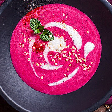 Die Hälfte der gekochten Roten Bete aus dem Topf nehmen, die vegane Kochcreme hinzugeben und mit einem Pürierstab alles fein pürieren. Wird die gesamte Rote Bete mitpüriert, wird die Suppe umso dickflüssiger und vollwertiger - Hier könnt ihr je nach Geschmack entscheiden.
