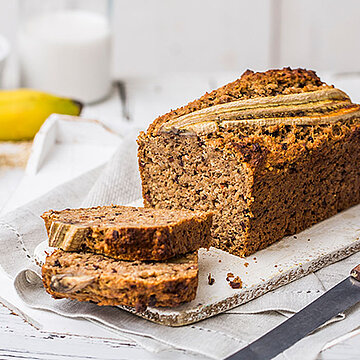 Wenn du Nüsse als Topping verwendest, achte darauf, dass sie nicht verbrennen. Wenn du ganz sicher gehen willst, dann decke zum Ende der Backzeit das Bananenbort zur Vorsicht mit einer Backfolie ab oder reduziere die Hitze ab Minute 30 auf 150° C, eventuell lässt du dein Banenenbrot dann 5 Minuten länger im Ofen.