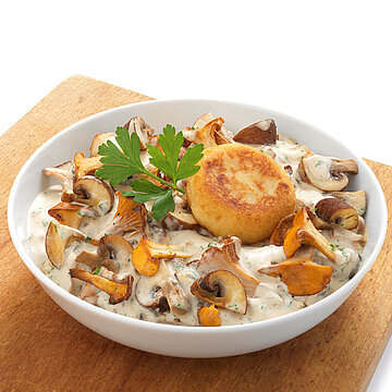 Pilzcreme mit Salz und Pfeffer abschmecken, Petersilie einstreuen und zusammen mit den Kartoffeltalern anrichten.